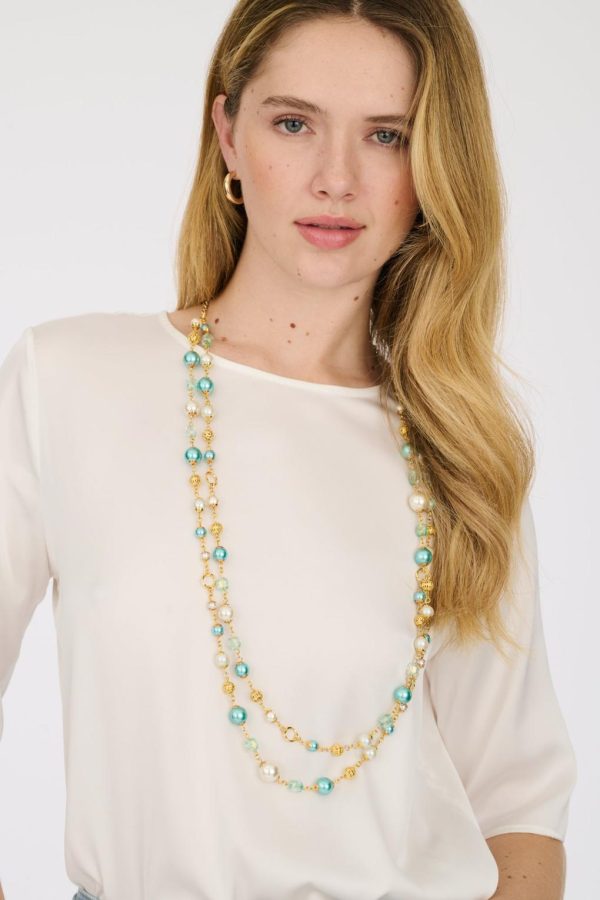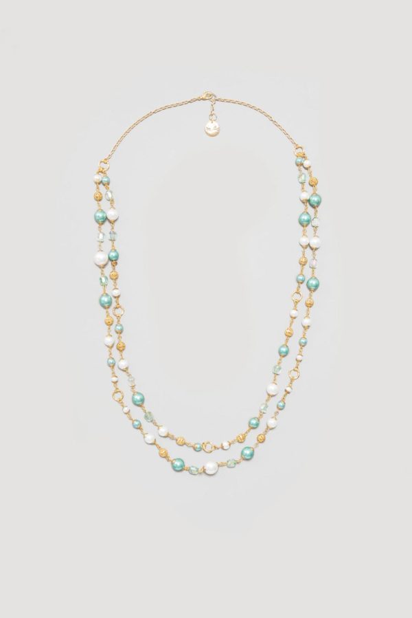 This refined double necklace elegantly combines pearls and stones with finely worked gold spheres.