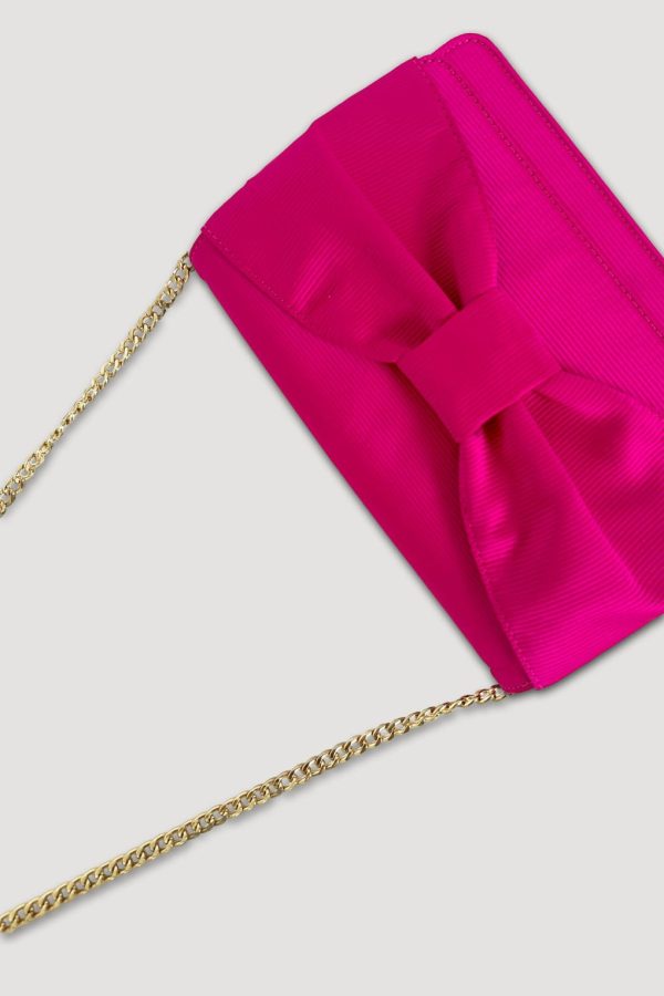 Elegant and refined fuchsia ottoman clutch featuring a decorative bow on the front and a detachable gold chain to add a touch of sophistication to your outfits. Its versatility means it can be worn as a clutch or shoulder bag, as you wish.