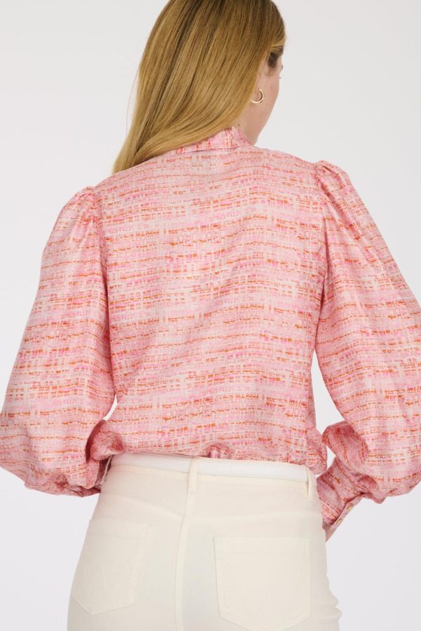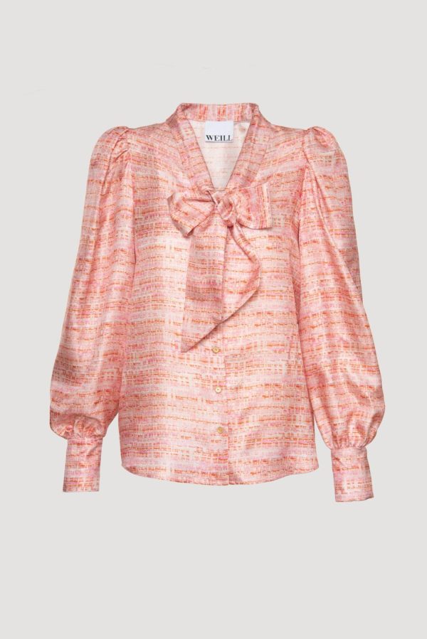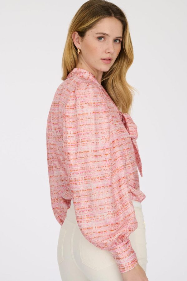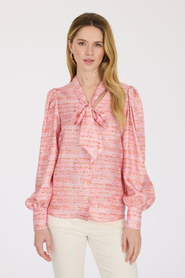 A flowing shirt with a pussycat bow collar for a chic, refined style in a palette of pink, coral and white tones for a luminous look.