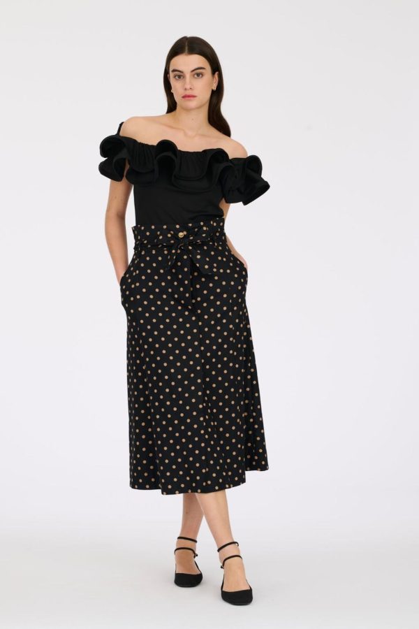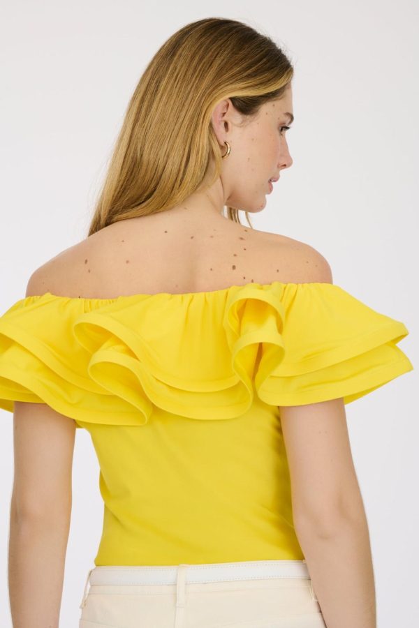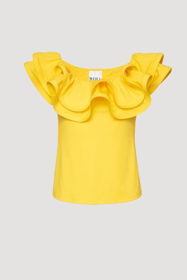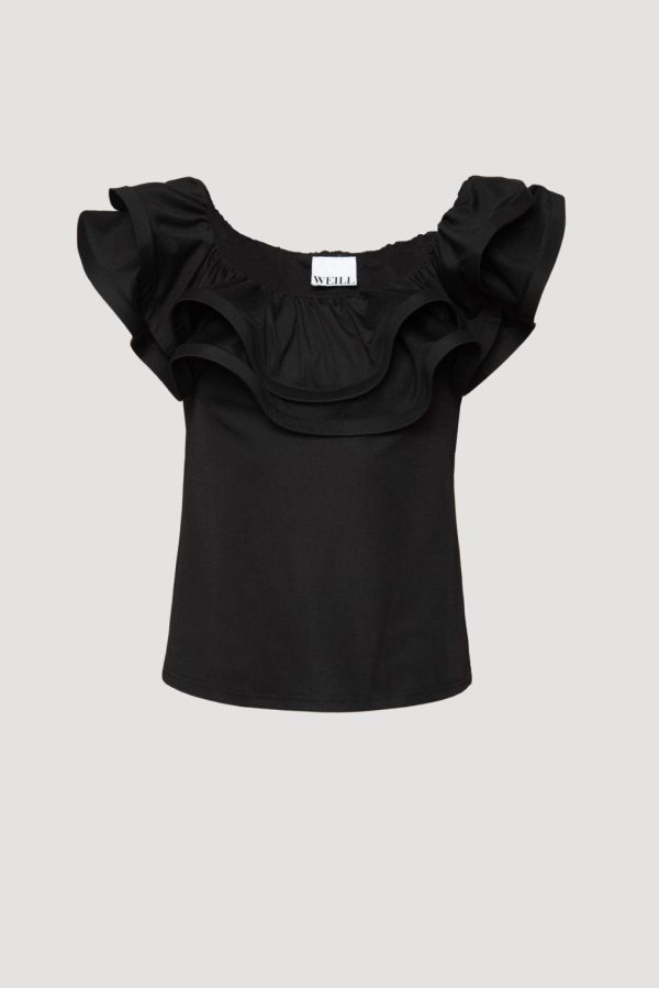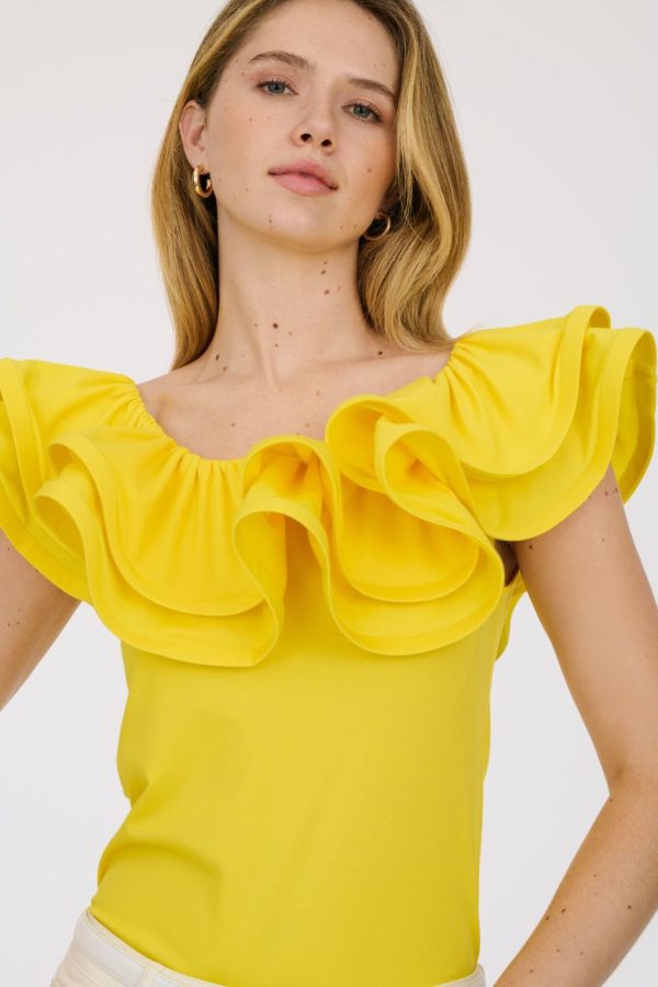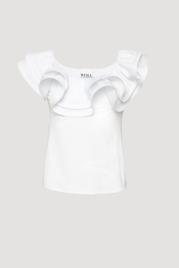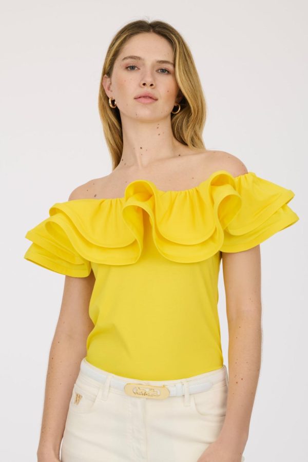 T-shirt with a ruffled bardot collar for a glamorous, chic effect.