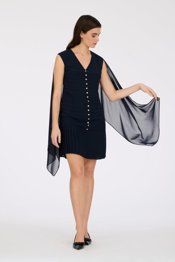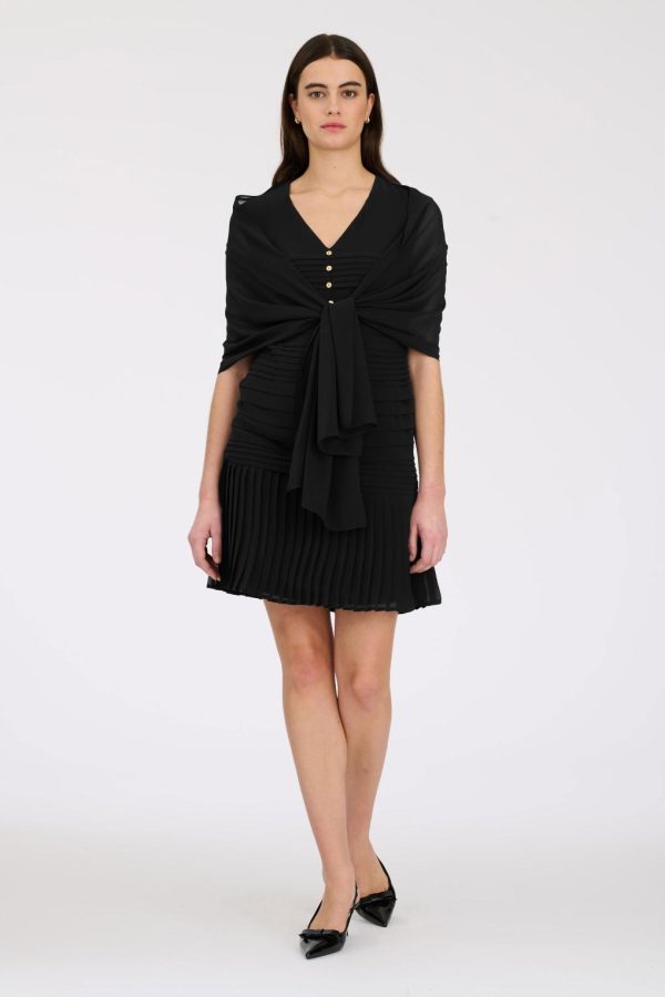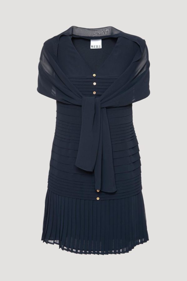 Pleated cocktail dress with a shawl-effect collar to tie at the front.