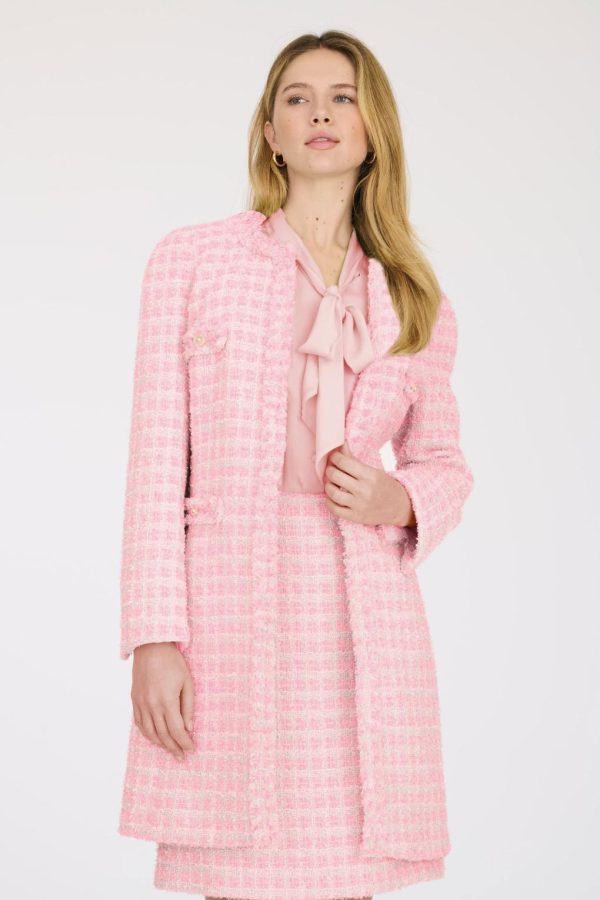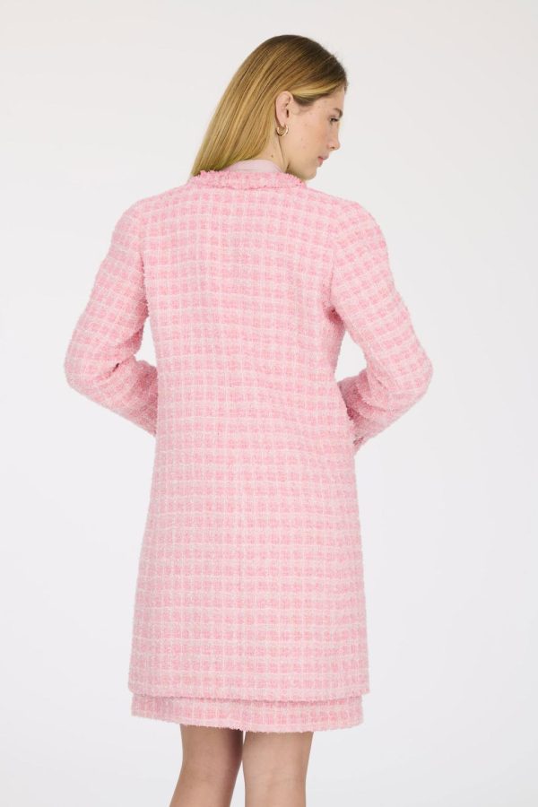 Long tweed jacket adorned with fringe and Weill custom buttons.