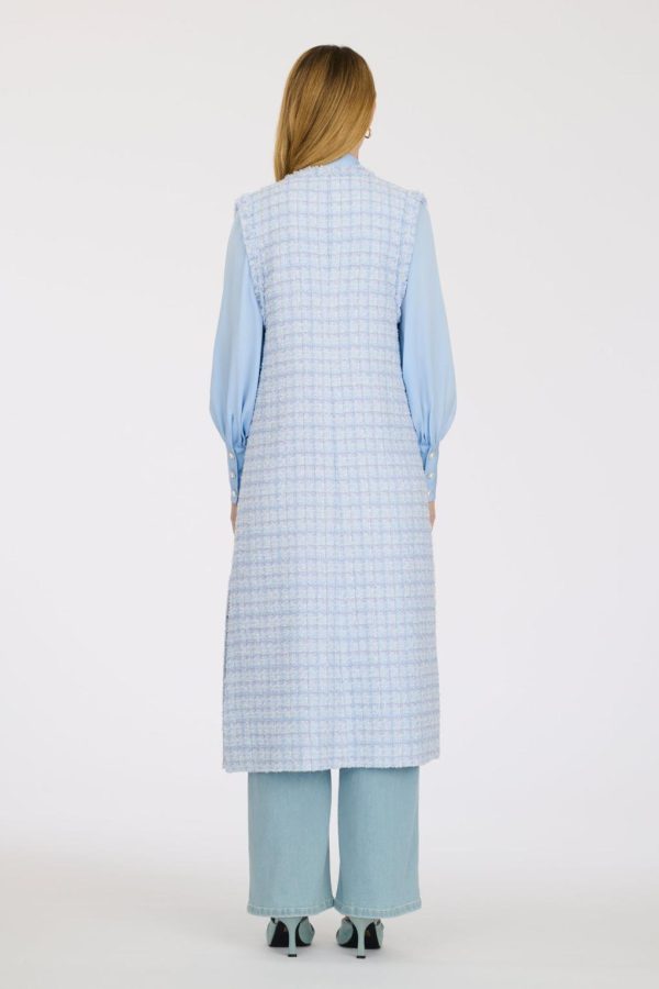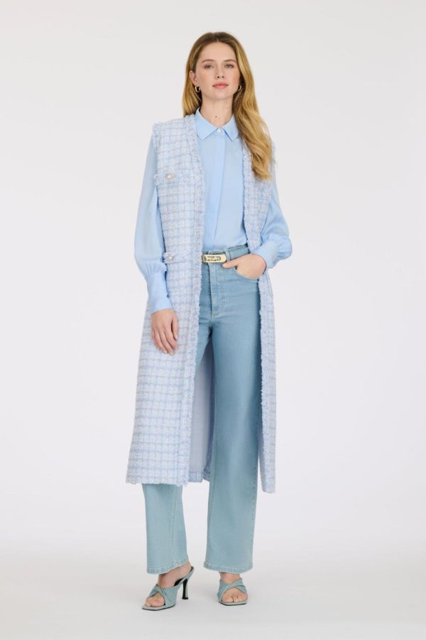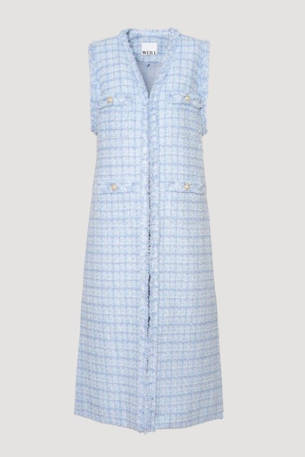 Long sleeveless fringed tweed jacket, decorated with customised Weill buttons