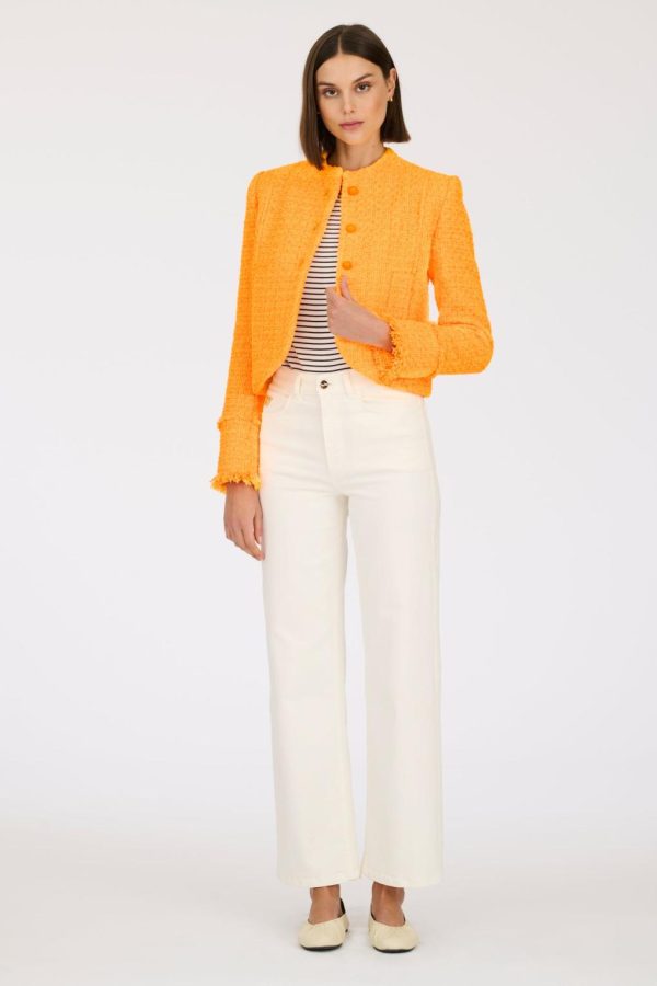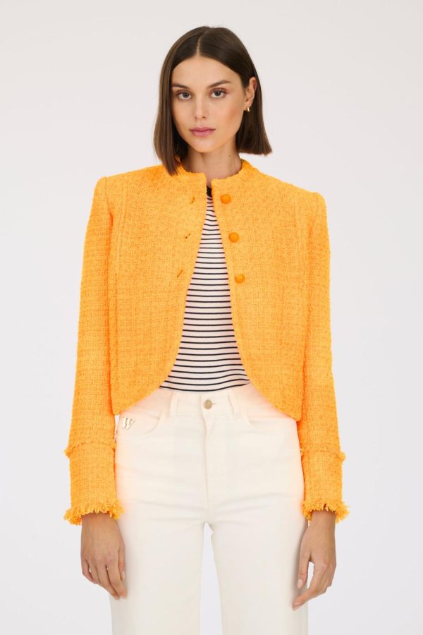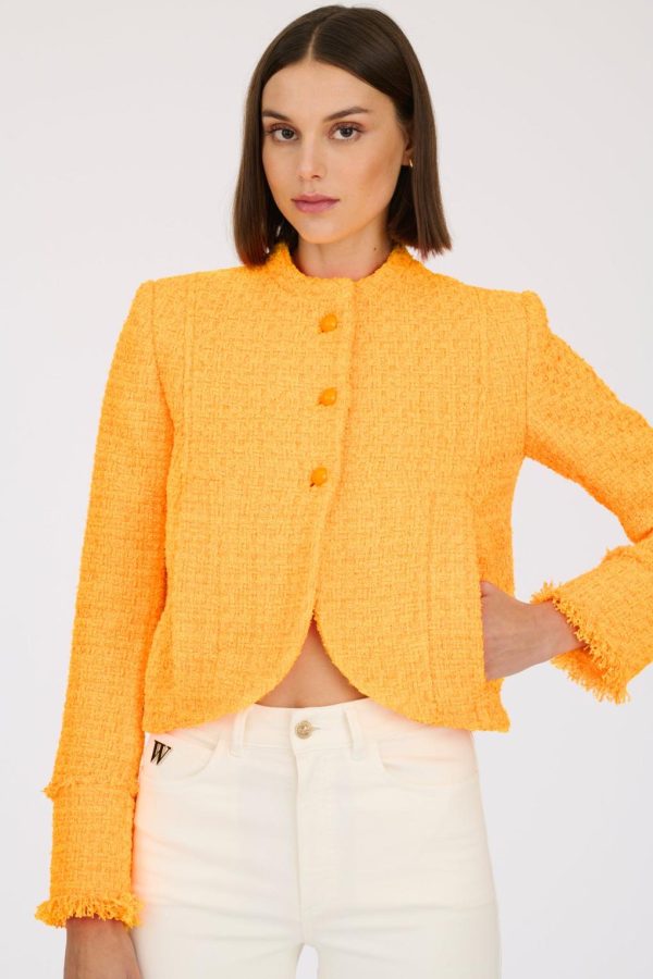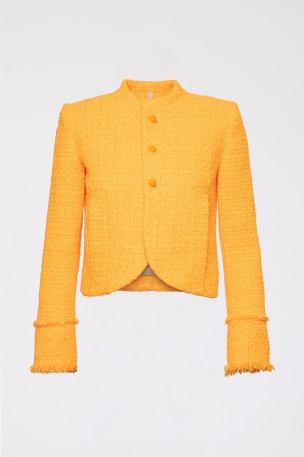 Orange tweed jacket with sequinned threads, featuring an officer’s stand up collar and personalised Weill buttons